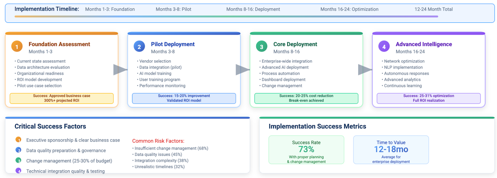 Successful AI supply chain optimization requires a phased approach that balances implementation speed with organizational readiness and risk management. This framework has been validated across 150+ enterprise implementations with average time-to-value of 12-18 months.