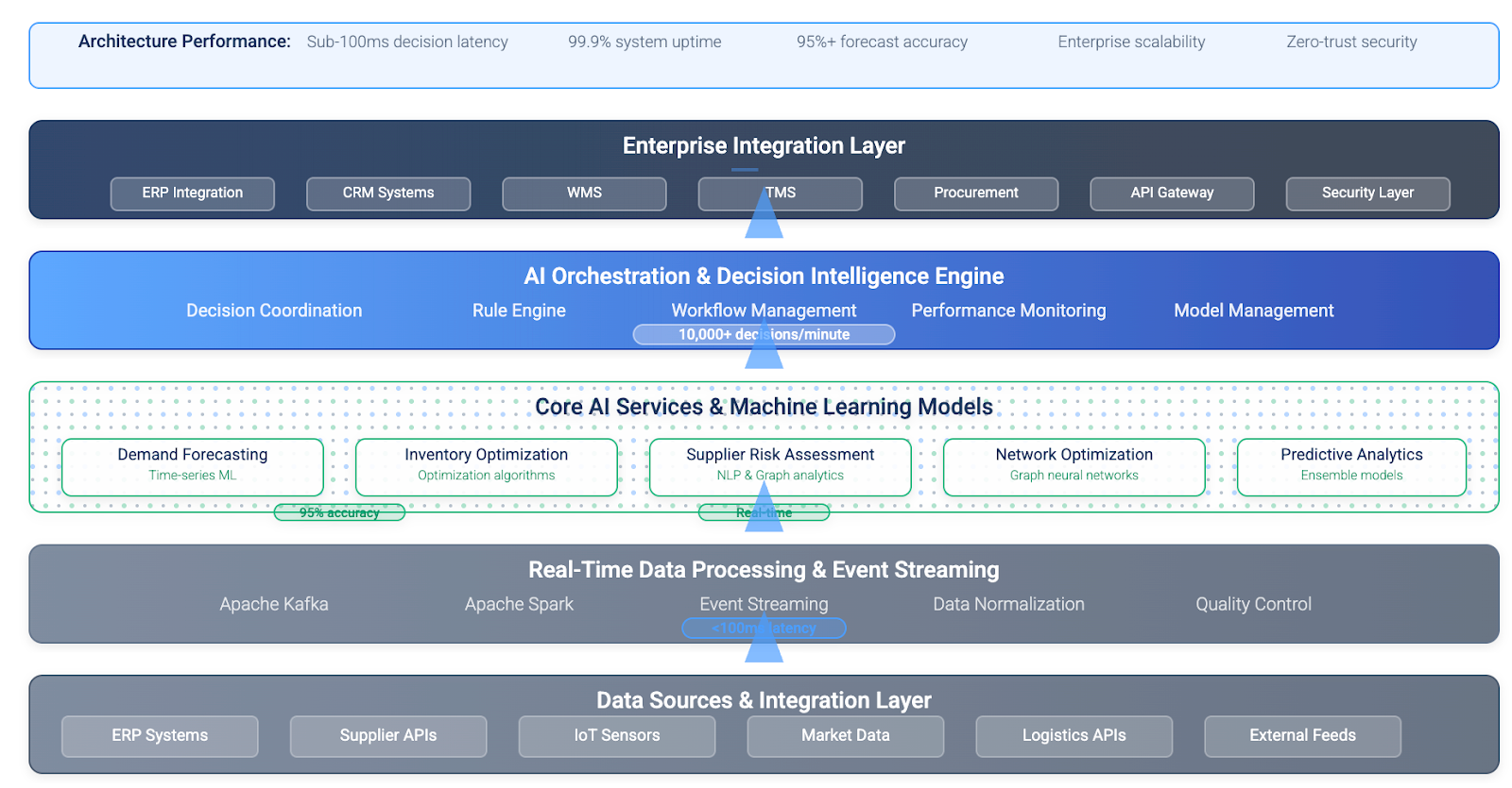 Model Performance Standards: Production AI systems achieve 88-95% forecast accuracy for demand planning, 92-97% accuracy for supplier risk assessment, and process 10,000+ decisions per minute with sub-100ms latency requirements for real-time optimization.