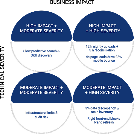 - Infrastructure Limits – On-premise servers required weekend maintenance windows to handle index rebuilds; peak-season traffic risked downtime.