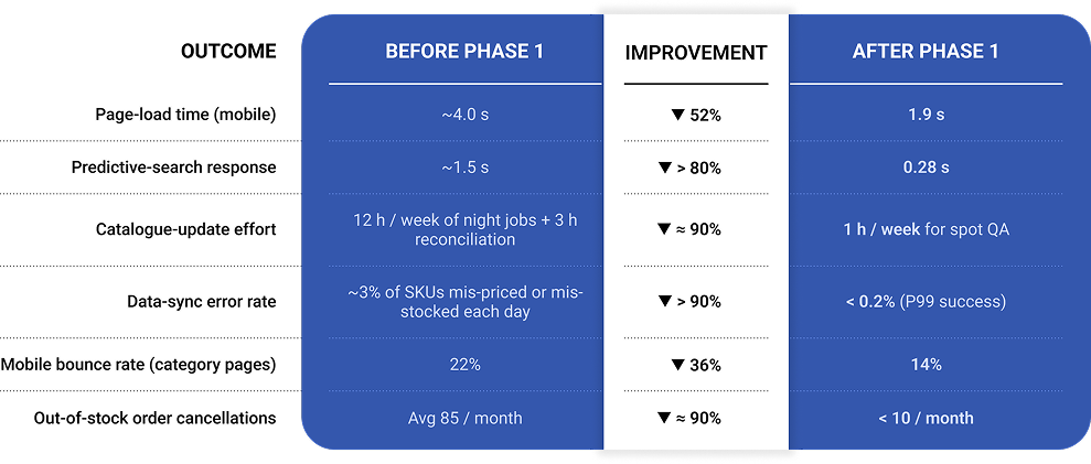 - Why it mattered – Overnight flat-file uploads left product, price and inventory data up to 24 hours stale; manual checks consumed three hours each morning.