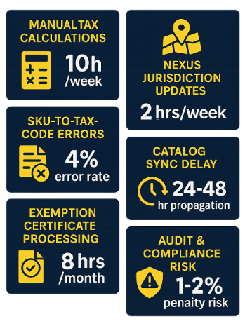- Catalog updates (new products, taxability changes) could take 24–48 hours to propagate through manual systems, leading to periods where tax calculations were based on stale data.